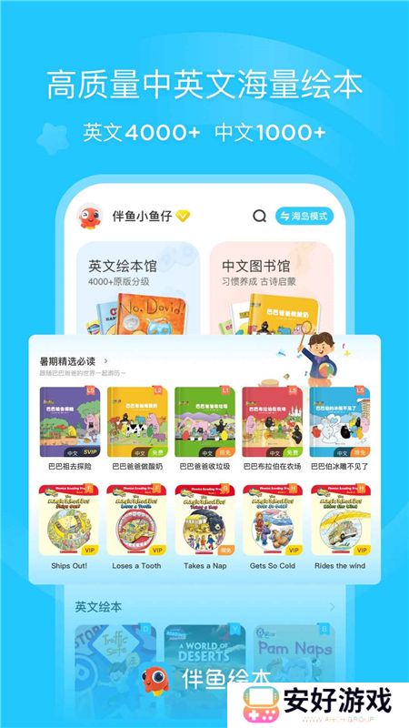 1.伴鱼绘本是一款通过听外教读绘本自己读绘本的方式对儿童进行英语启蒙教育的APP。