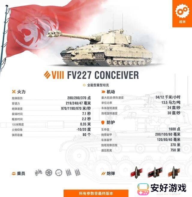 从当前的数据来看,FV227构想者定位为前线重型坦克,其玩法可以根据战场需求进行调整。玩家应充分利用其10度俯角和强大的炮塔装甲,依托地形进行作战。在战斗中,FV227构想者将成为团队的中流砥柱,为团队的胜利贡献力量。目前,该车仍在测试中,数据可能会根据测试反馈进行相应调整。
