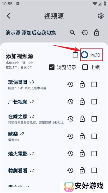 6、这时会弹出添加视频源界面,点击添加按钮将视频源添加到APP内。