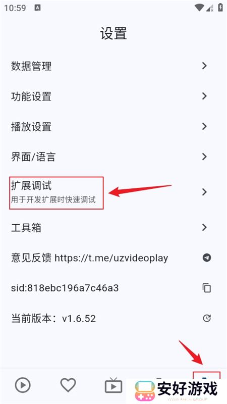1、点击右下角的齿轮按钮进入设置页面,找到扩展调试功能;