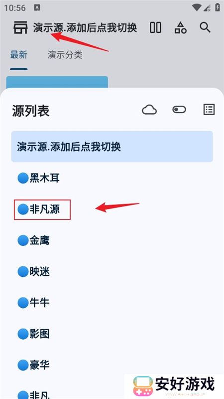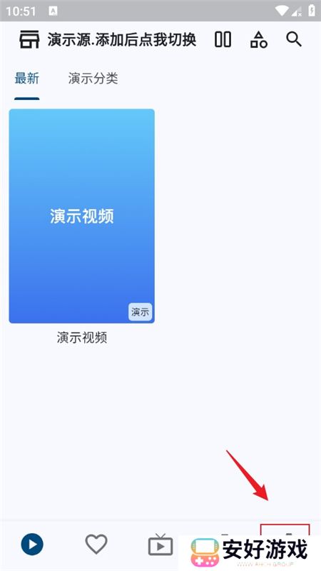 7、最后返回首页,默认是演示源,我们点击它,在下面的源列表中找到任意一个源进行切换即可。