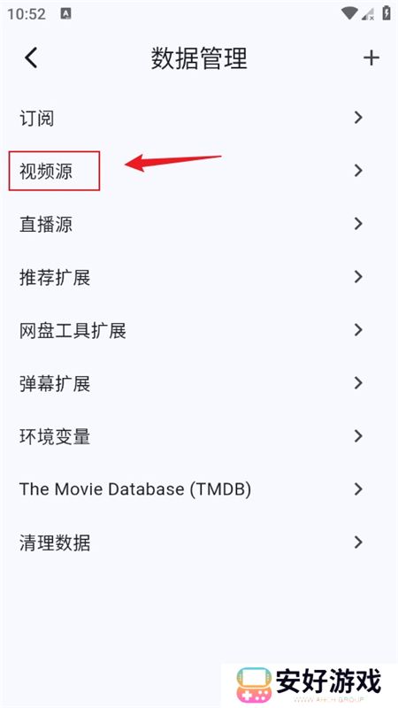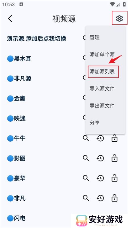 4、第一次进入视频源界面这里是没有任何的视频源数据的,需要点击右上角的齿轮按钮,然后选择添加源列表;