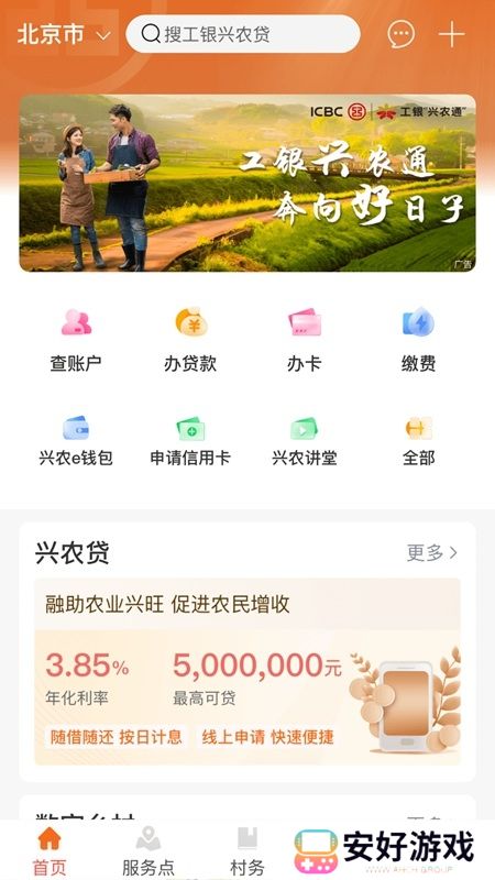 工银兴农通app官方客户端是由中国工商银行推出的手机应用,专为广大县乡村地区的客户打造的一站式金融服务平台app,提供信用卡申办、生活缴费、普惠贷款等多种功能,服务乡村人民,助力乡村建设。