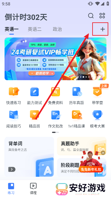 粉笔考研怎么设置考试类别1、打开粉笔考研APP,在“练习”的功能界面中选择点击上方的“+”功能,如下图;