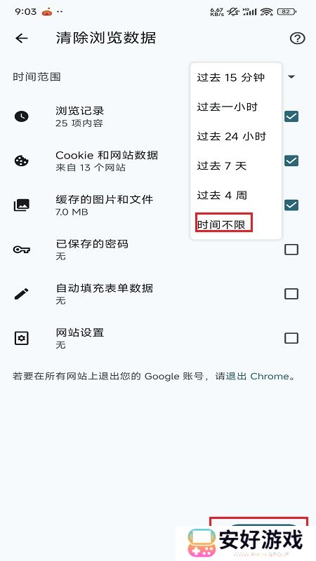 4、弹出清除浏览数据页面,这时你可以设置要清除的时间范围、浏览记录、Cookie和网站数据、缓存的图片和文件、已保存的密码、自动填充的表单数据、网站设置,点击右下角的“清除数据”按钮进行清除即可!