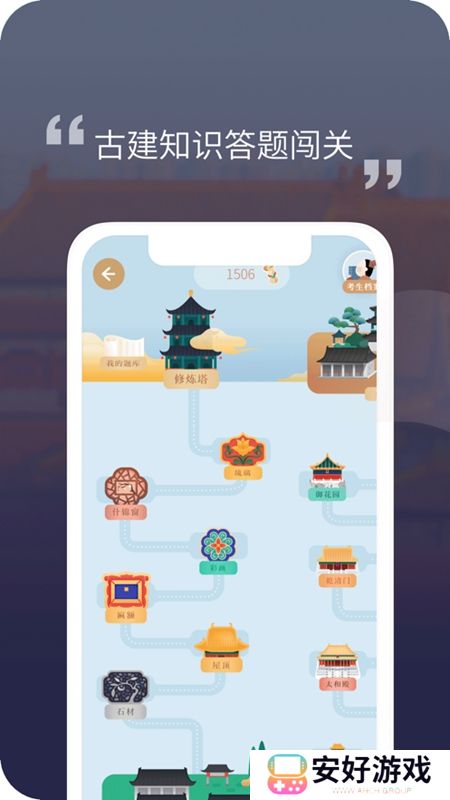 3.用户可以进入答题板块,从“初出茅庐”到“殿试夺魁”,挑战30个关卡、850余个古建知识问答。