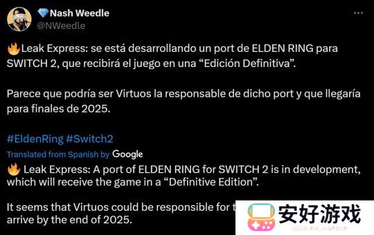 据知名舅舅Nash Weedle,《艾尔登法环:终极版》将在明年(2025年)登陆Switch 2。爆料说,维塔士负责移植,此前这家公司同样将F社的《黑暗之魂》移植到了Switch。
