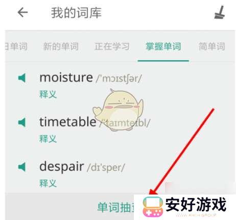 5、在我的词库页面中,点击掌握单词,向下滑动可以看到所有学过的单词,点击单词抽查可以检查自己还有哪些没有掌握。