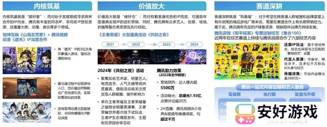 用户情绪、注意力成稀缺资源,IP发展同样需借力营销随着更多产品注重IP影响力的价值,用户情绪、注意力将成更稀缺的资源,与之相关的竞争将由蓝海转为红海。这意味着未来,IP发展状况与营销的关联将更紧密,取得高声量、高用户渗透等成果需要更适合自身IP的方式、更优质的运营资源、更高效的营销举措。而在自身资源、经验的带动下,高质量的合作伙伴将成营销效果的重要助力。其中,腾讯广告是高质量合作伙伴的典型代表,腾讯广告基于过往经验探索出适用于IP各阶段的运营思路,例如梳理出三项重要的IP运营目标:内核筑基、放大价值、赛道深耕,并给出实现每项目标的高效率方式:借力其他数字IP帮助内核筑基,通过品牌延展放大IP价值,运用人群破圈及品牌重塑来深耕赛道、持续打造IP壁垒。目标与实现方式之下,已经涌现的众多成功案例,也证明了腾讯广告的思路与执行能力。而在切实的营销效果之下,预计将有更多IP与腾讯广告合作。