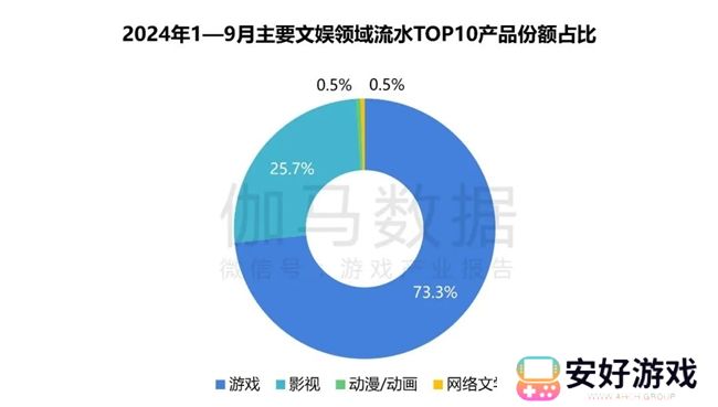 虽然IP具备高价值,但当进入变现环节时,不同领域的IP布局却展现出了较大的流水差距:对比2024年主要领域流水TOP10的产品可见,“游戏”单一领域独占了73.3%的流水份额,变现能力显著高于其他领域。