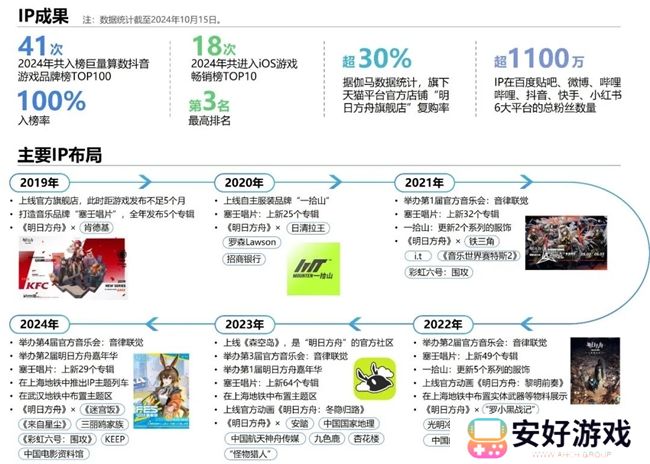 始终位列游戏品牌榜TOP100,“时间”助力IP与用户“双向奔赴”巨量算数数据显示,截止2024年10月15日,2024年抖音的游戏品牌榜中“明日方舟”共41次入榜TOP100,入榜率达100%。当前,“明日方舟”已成为国内头部游戏IP之一。伽马数据认为,“明日方舟”培育IP的核心因素之一是“时间”:例如其衍生品账号之一的“明日方舟朝陇山”在游戏上线之前已展开运营。换言之,服务用户、培育IP几乎贯穿了《明日方舟》的始终。而在贯穿游戏始终的时间基础上,鹰角网络在IP布局的频率、形式、质量等方面也保持业内头部的力度,最终为众多用户在游戏内、外创造了独属于其与“明日方舟”长久的充实回忆。而作为服务用户的回报,“明日方舟”也得到了高量级的核心IP用户:他们在游戏之内,使《明日方舟》在上线5年后的2024年仍能18次回到iOS游戏畅销榜TOP10;他们在游戏之外,能为官方衍生品店铺带来超30%的复购率、愿意自发举办IP的新春会。IP与用户实现了值得产业关注的“双向奔赴”。