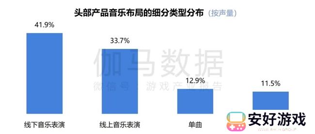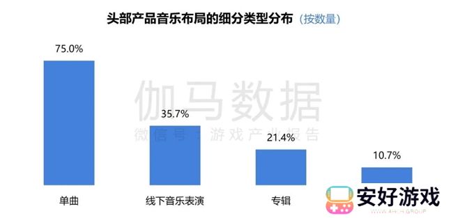 更多产品布局“单曲”以外的音乐形态,音乐呈现形态正向“更广泛”变化头部产品的数据显示,75%的产品布局了音乐单曲,线下音乐表演、专辑、线上音乐表演3种形态也分别有35.7%、21.4%、10.7%的产品布局。