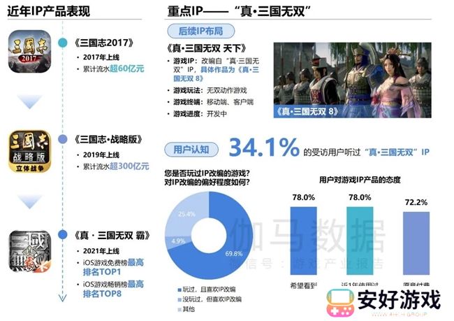 三项理由或助力IP业务后续表现如前所述,IP作品研发回归产品基本逻辑、版权方与被授权方合力运营IP,是IP产品的重要发展方向。伽马数据认为,盛天网络是较早布局上述方向、较早享受方向红利的企业之一:据伽马数据统计,近年盛天网络推出的IP产品共有《三国志2017》《三国志·战略版》《真·三国无双 霸》3款,却实现了总流水近400亿元、2款产品首年流水超10亿元的市场表现。关于未来,基于三方面原因伽马数据看好盛天网络的IP潜力,其一,盛天网络仍注重上述提及的两个方向,且在产品上打磨《真·三国无双 天下》等后续产品,合作上仍与光荣特库摩关联较密;其二,本年度IP市场呈现的部分特征,例如“老牌”IP表现较佳、与版权方关联较密的IP价值更高等,均与盛天网络的IP储备相符,或加持企业未来产品表现;其三,盛天网络也在拓展新的IP增长点,例如增加内部评定为S级、A级的IP获取。基于上述原因,伽马数据看好盛天网络的IP潜力。