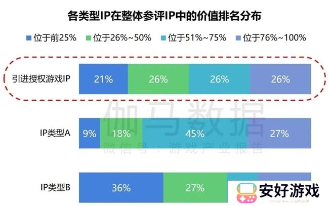 个体差异较大在于,虽然有21%的引进授权游戏IP位居整体参评IP的前25%,但排名在76%之后的IP数量占比也达到26%,高得分IP游戏与低得分IP游戏同样较多,IP间的差异较大。