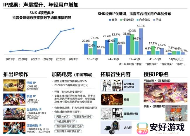 拥有超200项IP,4项举措显著提升IP声量及用户范围SNK是“拥有众多IP,且积极扩张IP影响力”的代表性企业。当前,SNK的IP数量超过200项,且已经较显著地提升了经典IP的声量、用户范围等内容。从具体布局来看,伽马数据认为SNK主要从4个方面提升IP影响力。第一,保持IP本体的更迭,“合金弹头”“侍魂”“拳皇”“饿狼传说”4项经典IP均于近年推出续作;第二,加码电竞,SNK旗下IP多为格斗、动作玩法,与电竞的适配度天然较高,因而电竞能起到更佳的IP运营效果;第三,拓展衍生内容,涵盖动画、漫画、衍生品等多种形式;第四,授权IP联名,SNK的IP形象出现在《王者荣耀》《和平精英》《美图秀秀》等不同产品中,较多产品位于业内头部,而其高额的用户数量、差异化的用户群体,有助于强化SNK旗下IP在各类用户中的知名度,进而扩大IP整体影响力。