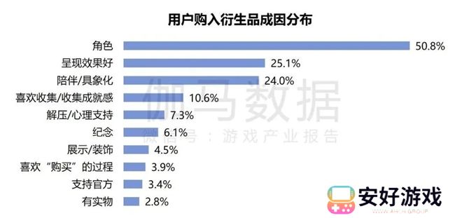 五成用户因IP角色购入相关衍生品,情感等因素带动衍生品发展带动衍生品市场增长的原因中,社会文化环境、用户情感需求、企业的用户环境需求、经济价值、产业链是重要原因。情感需求主要体现在用户希望与游戏产生更深入的链接上,例如约半数用户因为“角色”而购入衍生品。
