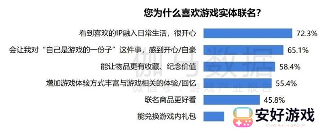 注:以上数据只统计布局了实体联名的游戏产品。“融入日常生活”是实体联名突出特征偏好实体联名的成因中,选择“可以融入日常生活”的用户占比最高,达7成以上,也是此类运营形式的突出特征之一。