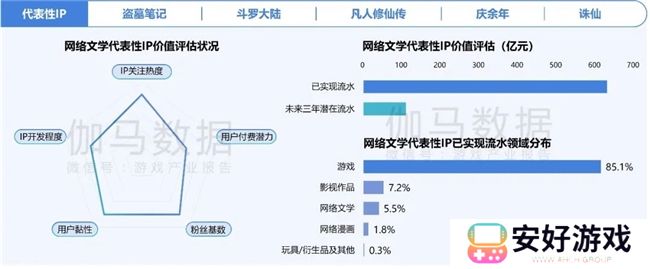 用户直接反馈之外,伽马数据也分类型对IP进行了价值评估。从评估结果来看,虽然各类IP均具备较高价值,但变现时表现最佳的领域依然是游戏。并且,无论是否源于游戏IP,多数代表性IP的大部分商业收入均源于游戏。