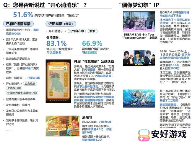 “惊喜”体验强化粉丝、IP的情感链接乐元素拥有“开心消消乐”“偶像梦幻祭”两个重点IP,并在持续运营下均取得了较显著的IP成果:51.6%的受访用户听说过“开心消消乐”;“偶像梦幻祭”下载量超1800万。其中,伽马数据认为,“开心消消乐”的IP影响力与其在沉淀了诸多运营举措的基础上,仍不断挖掘用户需求及市场变化、开拓创新有关,例如自主创办的“消除节”已举办至第5届,相关话题吸引了数亿阅读量;又如开展“寻龙笔记”公益活动,并强化趣味性、科学性,以便更好地传递科学知识。“偶像梦幻祭”在承接用户情感时格外细致,使IP在上线8年后仍能为用户带来诸多惊喜感受,例如新的“第一次”体验:第一次在国内举办DREAM LIVE线下演出、第一次在国内举办声优见面会;又如回应用户期待,与“时光代理人”IP二次联动,并通过深化联动内容创造超出用户预期的惊喜。正是在一次次承接用户情感的活动中,用户与IP、与角色的情感链接不断加深,并塑造了“偶像梦幻祭”不断扩大的IP影响力。