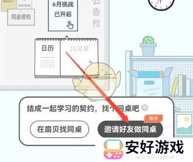 扇贝单词邀请好友做同桌的方法非常简单。用户只需打开扇贝单词APP,点击“同桌”或“发现”等相关选项,进入同桌功能页面,然后选择“邀请好友做同桌”,接着按照提示选择微信好友并发送邀请链接,等待好友接受邀请即可。