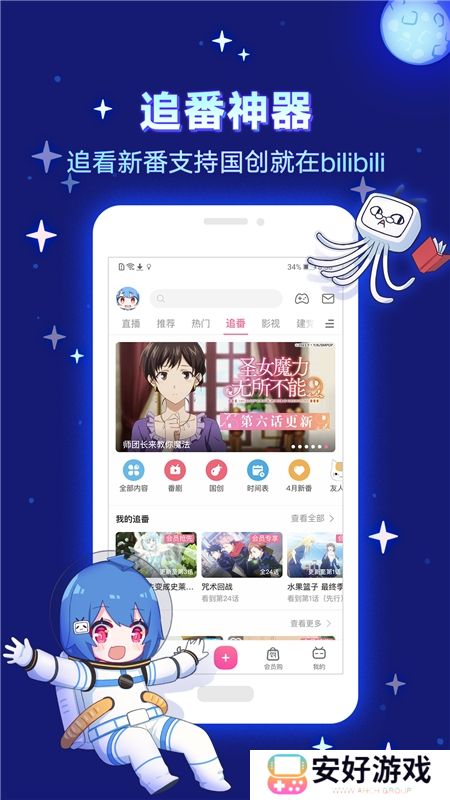2.哔哩哔哩动画App所包含的资源是非常丰富的,在其主界面上,可看到个人中心、分区导航、新番专题和放送时间表。所以,用户通过这些模块,可以快速的找到动漫的合集、相关的娱乐信息、音乐以及相关的游戏等,其内容十分的广泛。每当有新动漫更新时,相应的中文视频也会被快速的做出来并且退出来。
