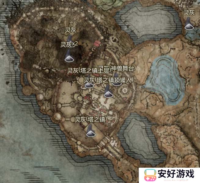 2、塔之镇入口处可以找到1个灵灰,击杀顶罐人可获得1个灵灰,塔之镇的上层6个小人跪拜的雕像前可以找到1个,神兽舞台右侧向上的电梯位置可以找到1个。