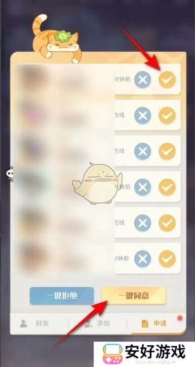 答:前往好友栏目点击添加,继续点击一键同意即可同意好友的申请