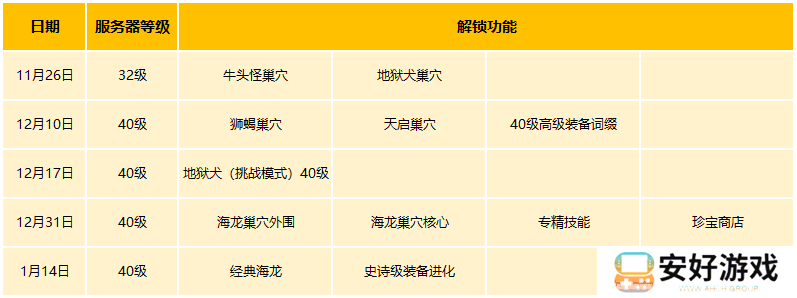 为了满足新手玩家的成长需求,新服“萨芬特拉”在初始阶段将服务器等级设定为32级,并在14天后逐步开放至40级。这一设定让新手玩家能够逐步体验40级版本的剧情和巢穴挑战,为后续的冒险做好充分准备。地狱犬巢穴(挑战模式)、海龙巢穴(外围+核心)等经典内容也将陆续开放,为玩家们带来更多的挑战和乐趣。