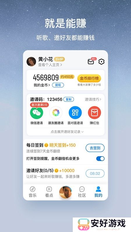 听歌、看视频、邀请好友……都能获取金币,快速提现!