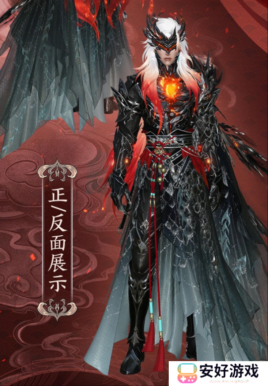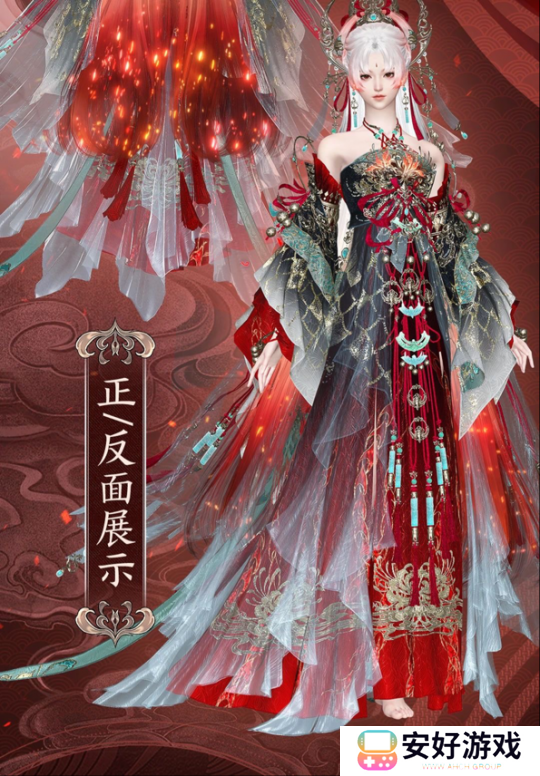 女款【灵巫绯云】裁剪精巧,勾勒神仙美人的姣好身形。炽热的红色与墨黑碰撞出独特的美感,让整套时装显得大气而精致。织锦裙身上金线龙鳞蜿蜒,孔雀蓝宝石点缀,彰显巫山神女的不凡地位。栩栩如生的彼岸花暗纹与赤焰绸带交缠,似乎将“永不相离”的誓言织进衣衫中,经历岁月的洗礼。