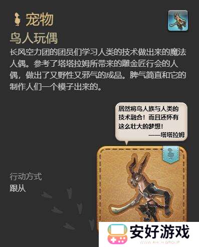 最终幻想14中有许多的宠物,很多玩家都想知道鸟人玩偶怎么获得,玩家花费25000金币在【鸟人族杂用商人】处购买即可获得,接下来就由小编给大家带来了详细的《最终幻想14:水晶世界》鸟人玩偶获得方法,希望这篇文章可以帮到大家!