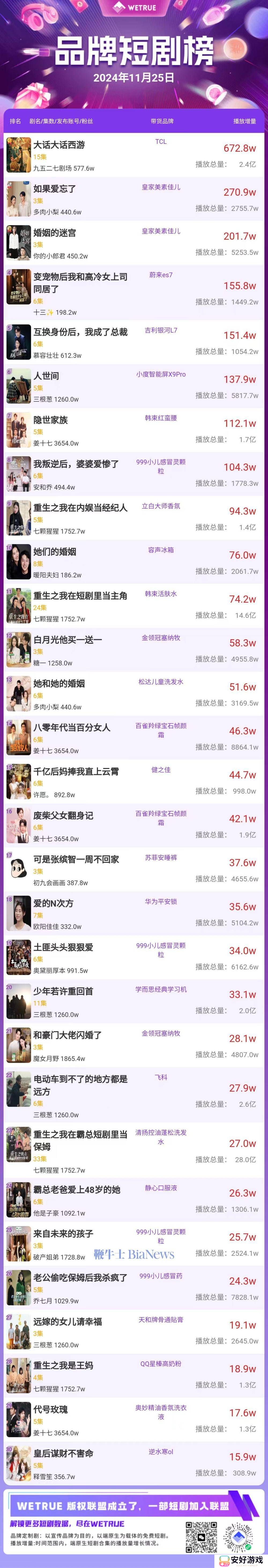 本次发布的榜单聚焦于前一日的品牌短剧表现。品牌定制剧,作为一种旨在宣传品牌、依托平台原生端呈现的免费短剧形式,日益受到市场关注。