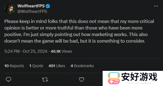 这其中包括 WolfheartFPS,他表示包括他自己在内的 3 名内容创作者没有拿到评测代码。随后他还补充指出,自己之前发布的包含更多批评的评测并不是导致自己没有获得测评代码的直接原因,并表示这只是正常的营销过程,并不意味着游戏质量会很糟糕。