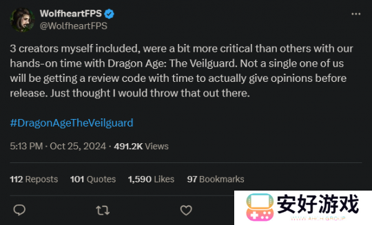 媒体 Fextralife 则更加直白。在最新发布的视频“关于《龙腾世纪:影障守护者》评测的真相”中,该媒体表示自己同样不会在首发前发布评测,因为自己同样没有获得评测码,即便此前同样为游戏给予了好评,并且当时的预览视频是油管上观看次数最多的视频之一。即便该视频下许多人甚至批评他们在“跪舔”生软,他们在预览后就再也没有收到 EA 和 BioWare 的联系。