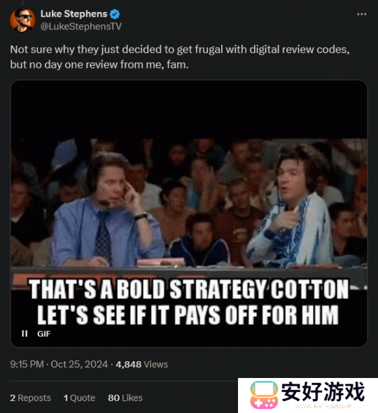 然而并不只有批评的人没能受到代码。另一位视频创作者 Luke Stephens 在此前的活动预览后的评测里分享了一些积极的看法,但也没有获得评测代码。在推特上他表示自己不会在首发时发表评测。