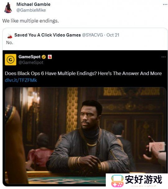近日《使命召唤:黑色行动6》发布,有人发推文哀叹该作没有多结局。Gamble回应称:“我们喜欢多结局”。Gamble提醒大家,BioWare非常重视多结局——尽管Treyarch和Raven并非如此。