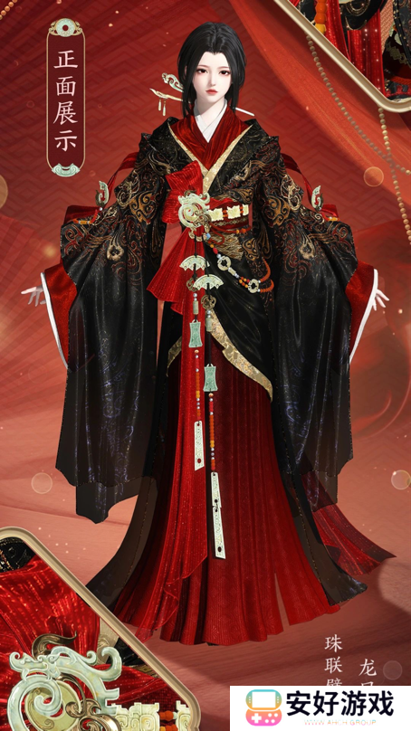 女款【珠联嘉礼】黑袍红裙,经典配色风华端庄。剪裁设计上宽袖窄腰,勾勒伊人曼妙身姿,颇有几分“战国袍”的味道。玄色华服上乘云绣样蜿蜒游走,如星辰一般熠熠生辉,通身佩戴的玉珏宝石似乎昭示了这场婚礼的盛大,腰间红绸宛如月老红线所化,与命定之人执手到老。