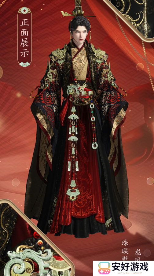 男款【璧合天成】则自带王者霸气,金色上衣与黑袍大袖混搭,威严中不失华贵。肩头精巧玉器环绕,贵气十足却又增添了几分力量感,头发利落束起,配上赤金冠冕,一看便知非凡气度。与女号同款的华丽珠宝、绮丽红绸,仿佛将一双璧人紧系在一起,共诉“愿得一心人,白首不相离”的脉脉爱语。
