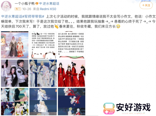 以至于活动刚开启,微博话题下秒变大型秀恩爱现场,满屏都是粉红泡泡,玩家偷师的偷师,有缘人互诉衷肠的爱情小作文也不少,随便刷一刷,都是甜蜜暴击。