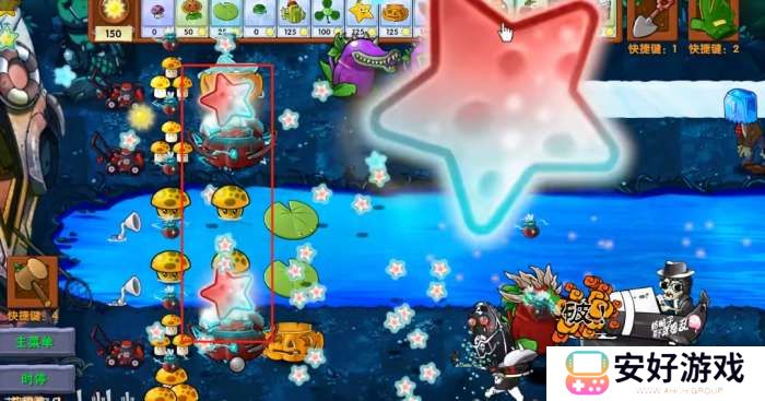 每隔一段时间可以生成一个大星星,向僵尸方向落下,变成几十颗星星攻击。