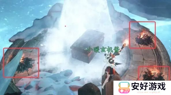 3、接着再次将薄冰踩碎并进入第三层,之后只需持续点燃在大冰块附近的三个篝火就能快速使其融化。