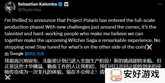 Kalemba在推特上表达了对项目的高度信心,他满怀激情地表示,开发团队正全力以赴,力求为玩家们呈现一场前所未有的游戏体验。他强调,整个团队都充满了对《巫师4》的热情和决心,每一个成员都在为这一共同目标不懈努力。