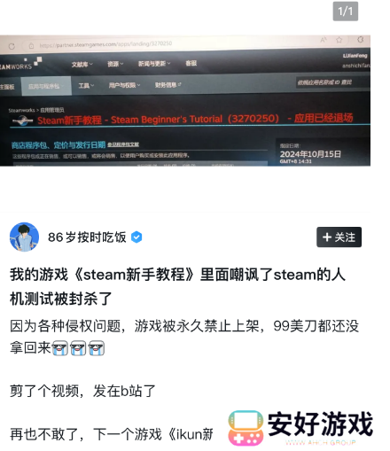 可令作者没想到的是,《Steam新手教程》仅仅只上线一天,就被V社给下架了。根据作者本人所发布的动态可知,这款作品因为嘲讽了平台的人机测试被永久禁止上架了。加之其中玩梗太密集,里面的一些内容还可能有侵权问题。