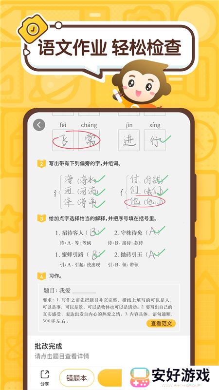 应用特点1.手机拍照,秒判对错:只需对作业拍照,一秒就能判断对错。可检查作业类型包括:小学数学(口算、填空、竖式计算等多种题型)、小学语文(单词听写、组词、近反义词等多种题型)、小学英语作业检查。