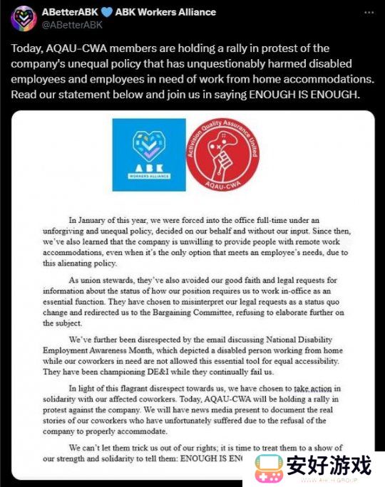 在抗议活动发生之前,动视工人组织ABetterABK发表声明称,这项“不平等政策”无疑损害了“残疾员工和需要在家办公的员工”的利益,并声称自该政策推出以来的几个月里,这些人被不公平地要求返回办公室工作。