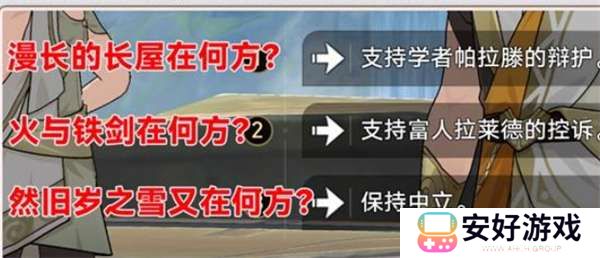 如果你选择了第一个选项【支持学者帕拉滕的辩护】时,将进入一场辩论,需要你做出三次选择。以下是正确的选择: