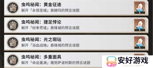 每张翁法罗斯地图上都有一个虫鸣秘闻解密任务,完成这些谜题后可以解锁相关的成就。