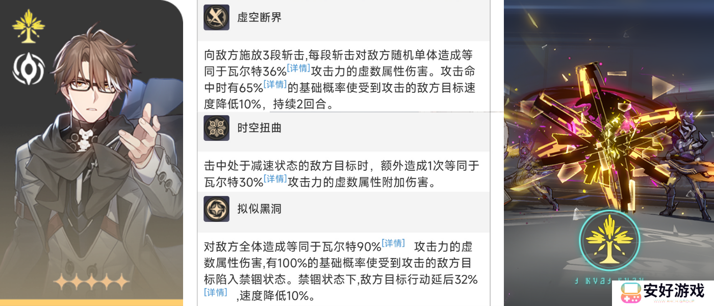 ▪原因在于其通用性,这在我之前的瓦尔特攻略里也说过,战技的弹射效果搭配额外伤害的天赋,瓦尔特在前期能当主C用,而到了后期作为副C,终结技能造成的全体延行效果极富开发价值。