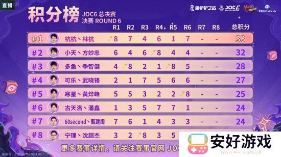 至此JOC6**落幕,接下来迎接各位弈士的是更高级别的赛事——于11月8日开启的全球总决赛。本届JOC6全国总决赛获得第1-4名的多鱼丶季智健、小天丶方妙忠、杭杭丶林杭、60second丶甄建阔四位选手直通全球总决赛,第5-8名选手将进入全球总决赛-CN赛区资格赛,与TOC9晋级选手竞争最后的全球总决赛参赛资格。