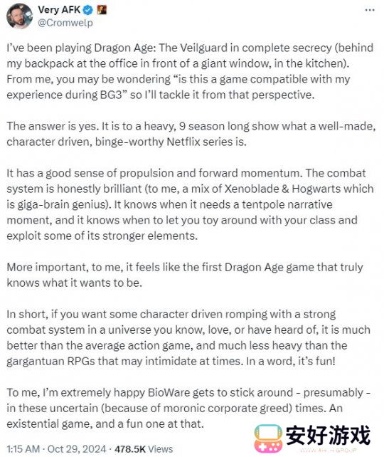 《龙腾世纪4:影障守护者》媒体评分已解禁,许多媒体和评测者对该作的评价纷至沓来。《博德之门3》发行总监Michael Cromwelp Douse也发推文,给予《龙腾世纪4》高度评价。他认为这是一款“真正知道自己想要成为什么样子的《龙腾世纪》”,值得RPG粉丝花时间去体验。